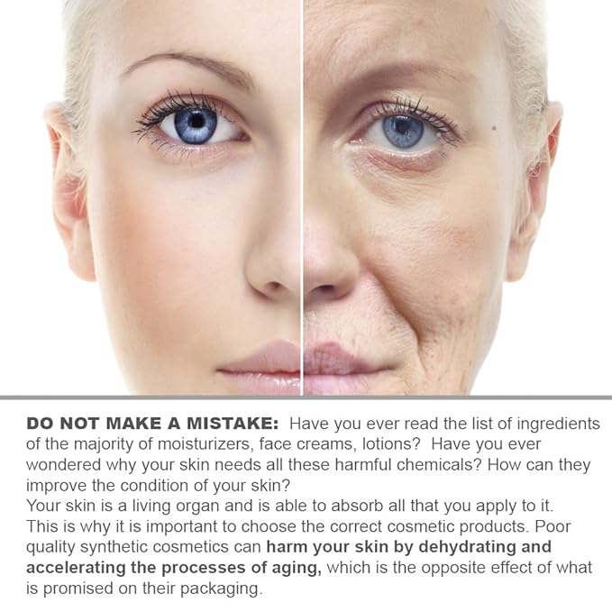 - DO NOT MAKE A MISTAKE: Your skin is able to absorb all that you apply to it. This is why it is very important to choose the correct and safe cosmetic products. Poor quality synthetic cosmetics can harm your skin, dehydrate, accelerate processes of aging. When we were developing our Organic Moisturizer formula - we were thinking about the health of your skin as our first priority.
