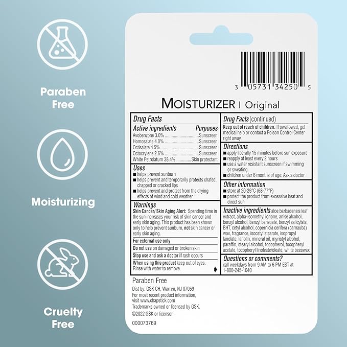 - LIP CARE WITH SUN PROTECTION: Stock up on 3 tubes of the Moisturizer 2-in-1 Lipcare Original ChapStick – perfect for protecting your lips from UV rays.