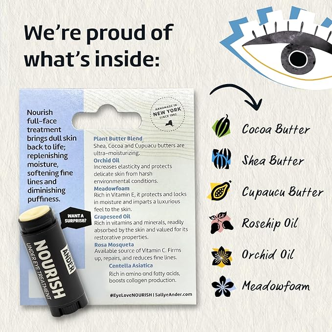 - LIGHTWEIGHT, NON-GREASY TEXTURE: Our convenient no-mess stick makes Nourish a no-brainer for quick application to tired eyes. No greasy cream or lotion that sits on top of the skin - our stick applies easily and soaks into the skin under your eyes, soothing gently and thoroughly. We’re the premiere eye cream choice for tired eyes everywhere!