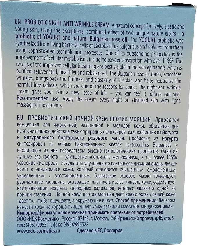 - The YOGURT PROBIOTIC improves the cellular metabolism. The Bulgarian ROSE OIL tones, smoothes wrinkles, brings back the firmness and elasticity of the skin, and helps neutralize the harmful free radicals, which are one of the reasons for aging.
