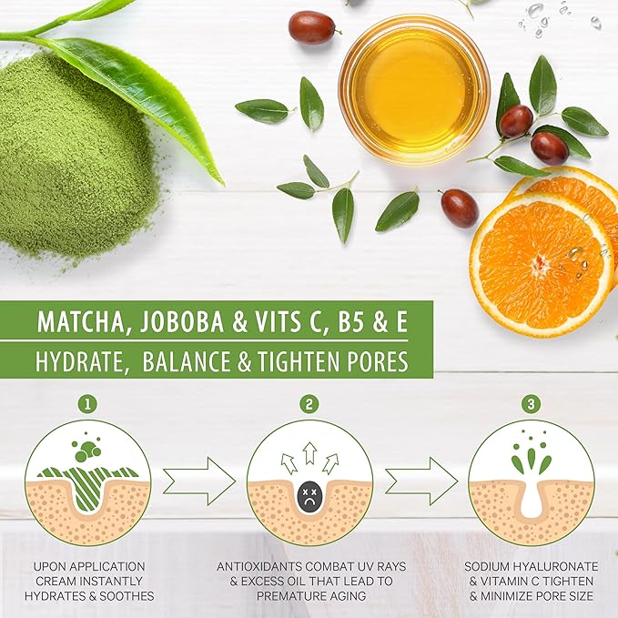 - 🍊 Awarded Best Vegan Moisturizer by VegByte – Leading National Influencer on Vegan Health & Lifestyle. No other Green Tea or Vitamin C moisturizing cream contains the level of peptides from Green Tea Matcha, Licorice Root, Aloe, Jojoba, and Vitamin C clinically proven to address wrinkles, age spots & under eye dark circles. The vitamin-rich formula also shrinks pores and prevents acne, breakouts & blemishes, providing the perfect start to your morning skincare routine.