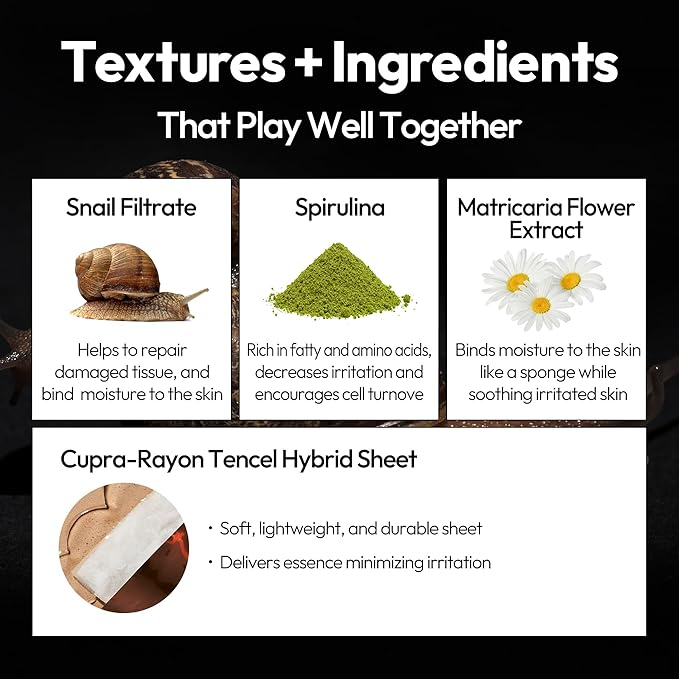 - REGENERATING SNAIL SKINCARE - Our Escargot cupra rayon and tencel sheet mask, rich in revitalizing benefits, helps to reverse environmental damage for a youthful complexion