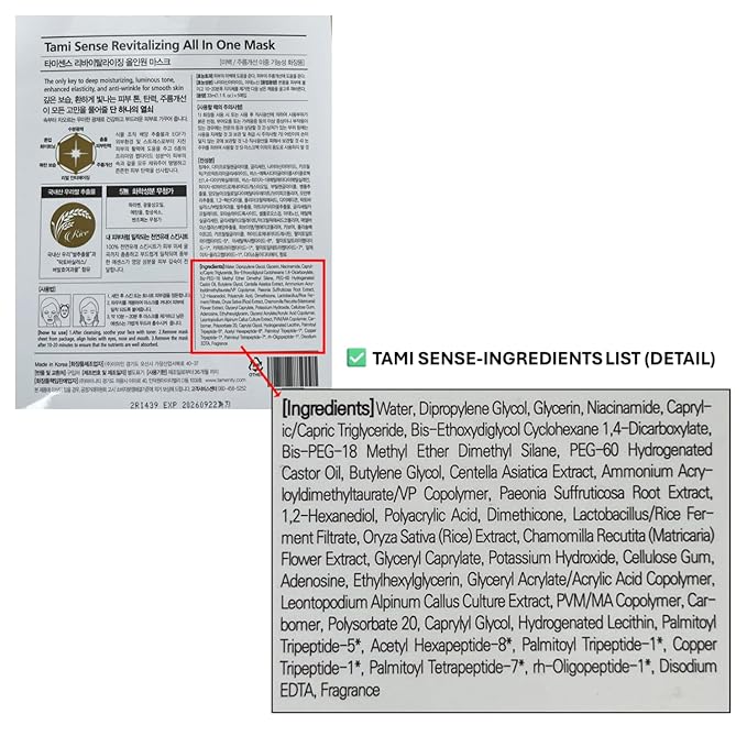 - Tami Sense Revitalizing All in One Mask 2 SET (5 EA): Better ingredients like Rice Fermented Extract Serum, Botanical Stem Cell Sheet