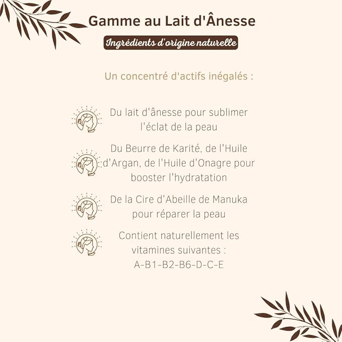 - DONKEY MILK FACE CREAM: Donkey's milk is the closest thing to mother's milk. Packed with vitamins (A, B1, B2, B6, C, D and E), it is renowned for its benefits for all skin types. Highly moisturizing, it regulates the problems of dry, sensitive skin. Apply morning and night. On a daily basis, it nourishes your skin.