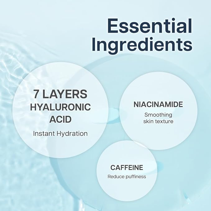 - ACTIVE INGREDIENTS: 7 different types of HYALURONIC ACIDS hydrate skin from the deepest layer of skin to the very top. Ingredients like caffeine and vasoconstrictor de puff and soothe, while Vitamin E and other enzymes work as a natural exfoliant, sloughing off dead skin cells to promote beautiful skin. Meanwhile, the natural ingredients in this gentle face toner work to calm sensitive skin.