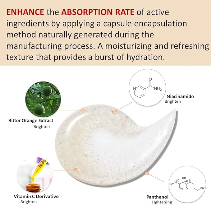 - 🌿HIGHLIGHTS:1) Vitamin C-rich bitter orange extract (Poncirus trifoliate C) helps reduce dark spots and freckles. 2) Containing Niacinamide, Arbutin, and Vitamin C, this facial serum provides an intense brightening skin care. 3) Clinically proven to reduce dark spots and freckles by 44.3% after 4 weeks of use. 4) The micro-capsules inside the formula are filled with bitter orange extract, Vitamin C, and Vitamin E. 5) Certified by EVE VEGAN; no animal testing and contains no animal ingredients.