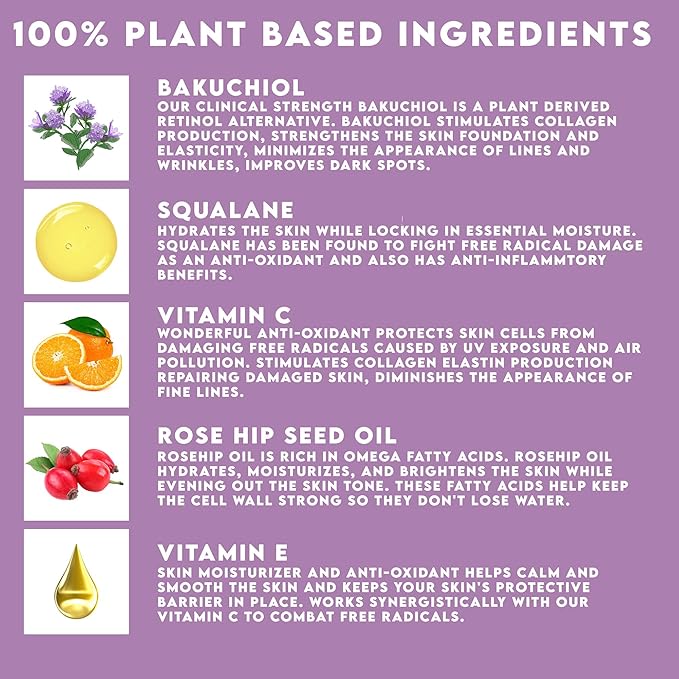 Bakuchiol Facial Serum Oil 1.7 oz - Retinol Alternative - Clinical Strength Bakuchiol - All Natural Plant Derived Clean Beauty Ingredients - Bakuchiol, Squalane, Vitamin C, Rose Hip Oil, Vitamin E -