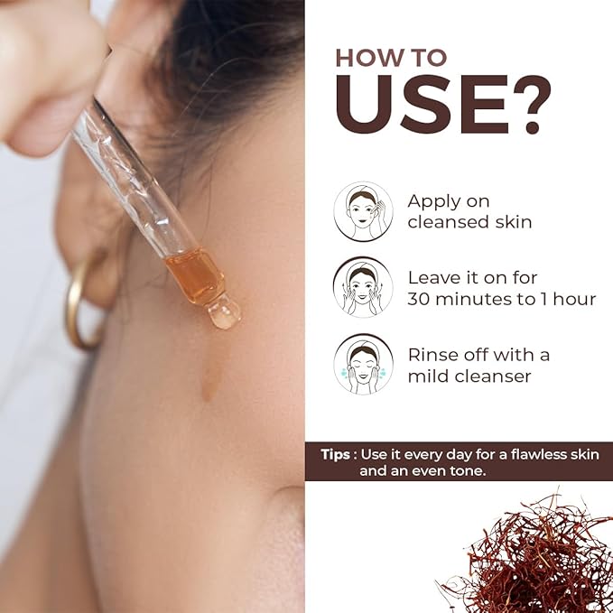 - Directions Take 3-4 Drops apply Evenly to your Face neck. Gently Massage with your fingertips for 1-2 minutes in upward motion. Leave it on for 30 minutes to 1 hour and wash off with a mild cleanser. Use it every day for healthy glowing and even skin tone