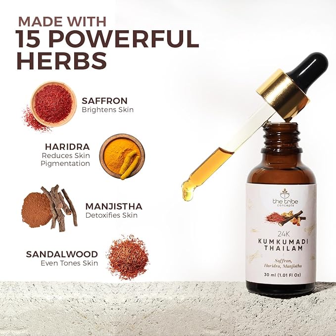 24k Kumkumadi Thailam, Skin Brightening, Oil, Toned Glow Enriched with Saffron Sandalwood, Chemical Free Natural, 30 ml Pack of 1 Standard