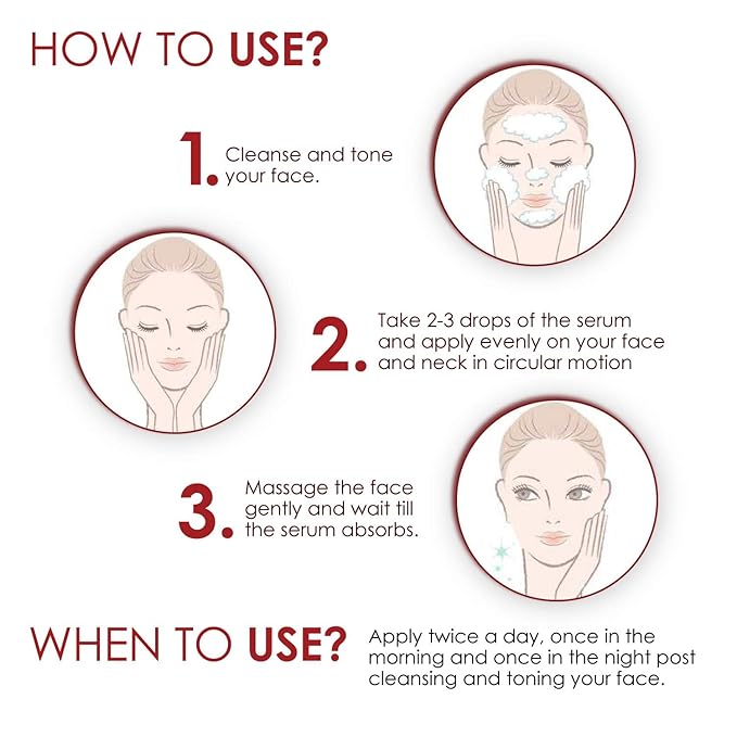 - How to Use: After cleansing properly, apply 2-3 drops of the serum all over the face. Gently massage into the skin with your fingertips until it is fully absorbed