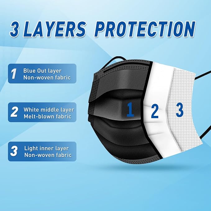 - High Quality 3 Layer Face Masks: 100 Pack Disposable Black Face Mask. 3 layer black disposable face mask with white inside