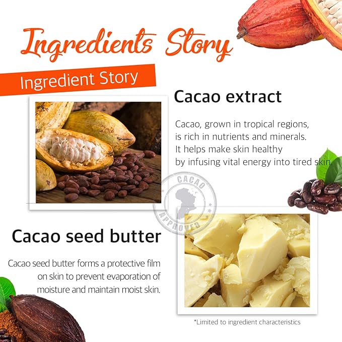 - Healthy Energy: Cacao Extract and Cacao Seed Butter deeply hydrate and impart a healthy glow.