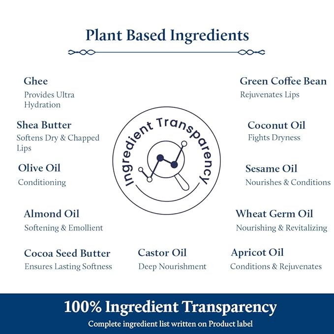 - COFFEE LIP BALM for DRY CHAPPED LIPS: Contains Ghee and 8 Natural Oils like Almond Oil, Olive Oil etc that are known for their deep hydration properties.