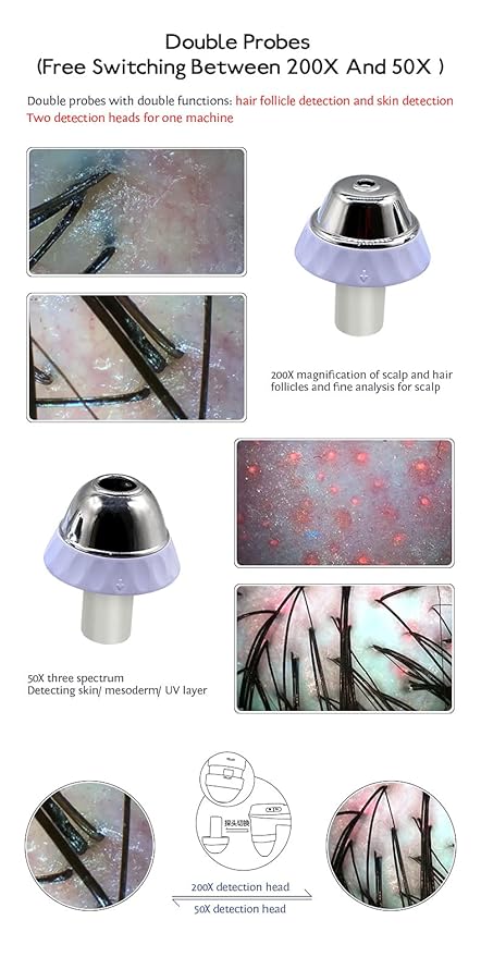 - Four-Spectrum Detection (200X magnification + 50X three spectrum) 20oX optical enlargement to magnify scalp and hair follicle with 8ooX resolution 5oX three spectrum to detect three different problems for scalp and skin White light (skin detection):observing dry and oily scalp, clogged hair follicles,
