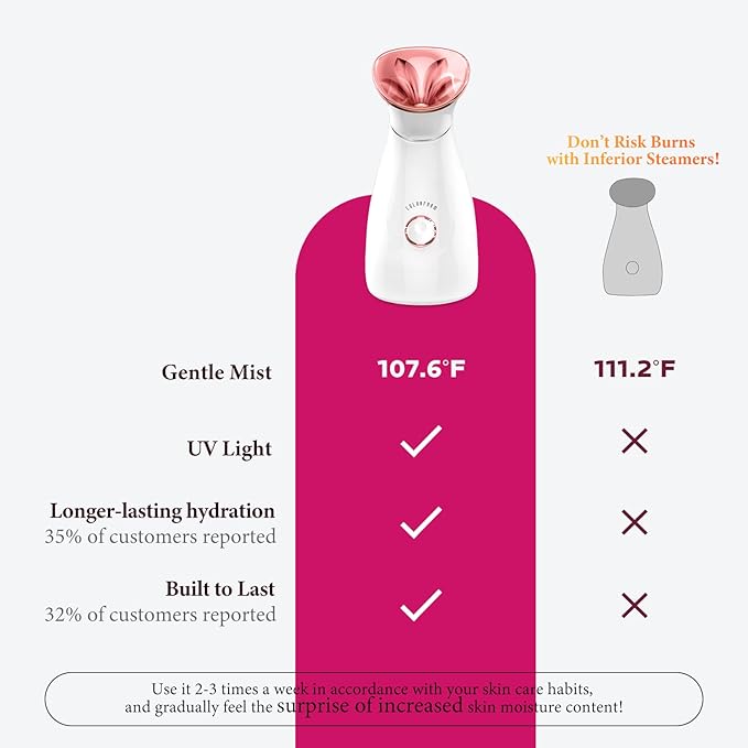 - Professional Facial Care: The face steamer for facial takes only 10 seconds to release a fine mist of nano ionic steam, gently cleansing deep within your pores and opening up your skin's absorption channels. Enjoy a comfortable at-home spa experience with a soothing steam temperature of 104℉ and an 15-minute runtime
