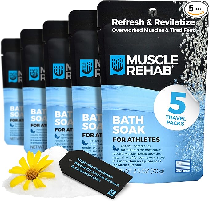 - Foot Soaking Salts - Indulge your tired achy feet and body in the rejuvenating embrace of Muscle Rehab's Epsom Salt with Magnesium foot soak bath. Crafted with a purpose, this concentrated blend of arnica, turmeric, and USP Epsom salts provides real recovery from aches and stiffness, offering reliable pain relief after a long day or intense workout.
