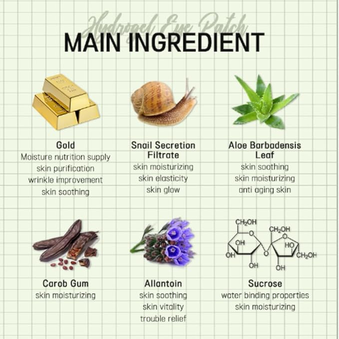 - Hydration & Firming: This hydrogel eye patch contains powerful snail secretion filtrate and gold extract to deepl hydrate and firm the skin around the eyes, reducing puffiness and improving elasticity.