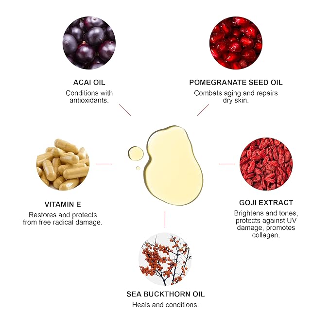 - SUPERFRUIT RADIANCE - Promotes skin elasticity with natural essential fatty acids to boost hydration, reduce redness, and offer soothing benefits to calm acne with cranberry, blueberry, pomegranate, prickly pear, raspberry, and sea buckthorn.