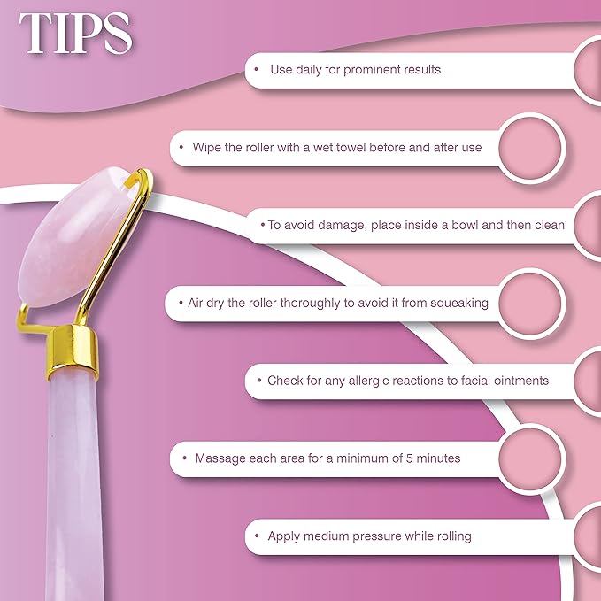- [TIPS]: Keep your rose quartz beauty roller from breaking by wiping it with a wet towel. If rinsed, first wipe then dry it with a blower as the water can cause rust which causes it to squeak