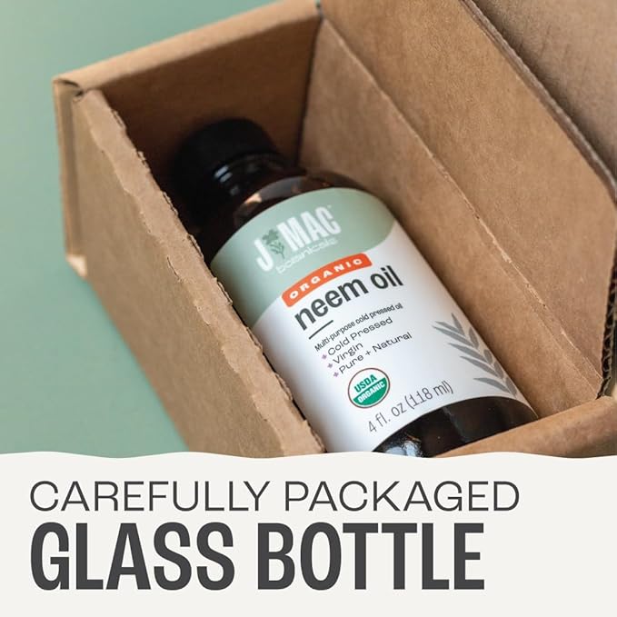 J Mac Botanicals Organic Neem Oil for Skin (4 oz Glass Bottle NO Dropper) - 100% Pure Concentrate Undiluted for Hair and Plants - Essential, Cold Pressed