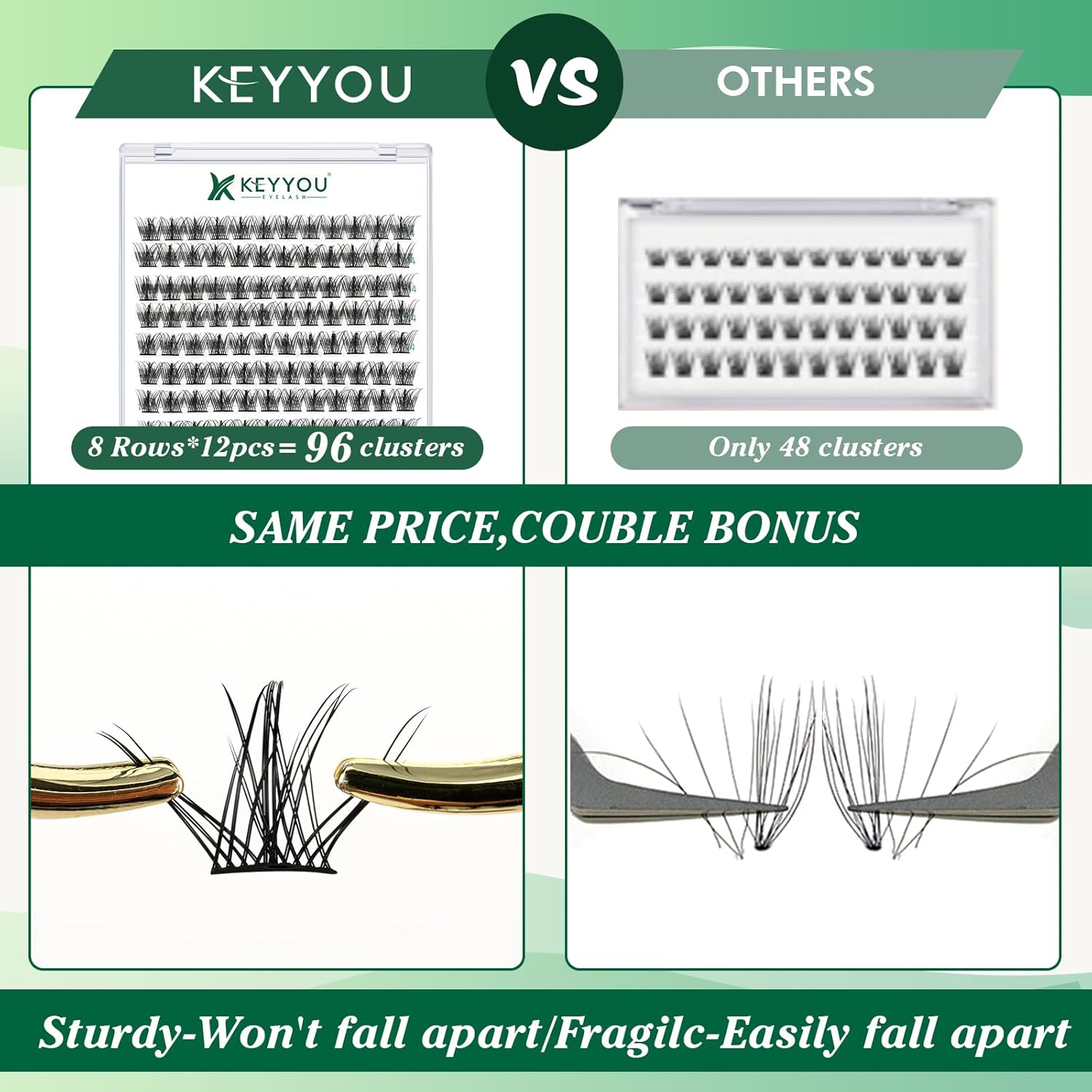 - 【Soft&Comfortable】KEYYOU lash cluster are made of imported materials,the stem line is thinner and softer, the eyelash cluster are lighter and more comfortable to wear.96 clusters in one tray ,more cost-effective.