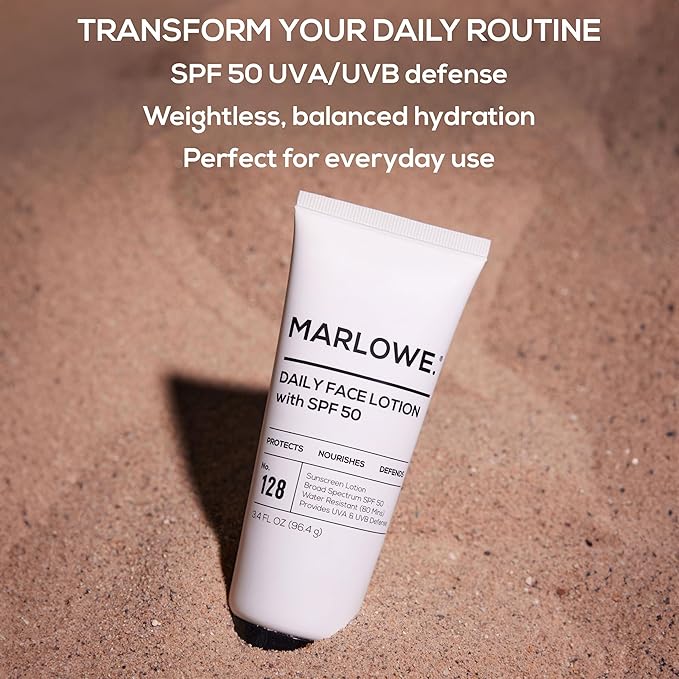 - EXPERIENCE THE MARLOWE. DIFFERENCE: Our non-comedogenic, oil-free mens face lotion with SPF 50 sunscreen is crafted with aloe vera and shea butter to lock in in moisture and help soothe skin without a greasy after-feel. Water and sweat resistant for 80 mins