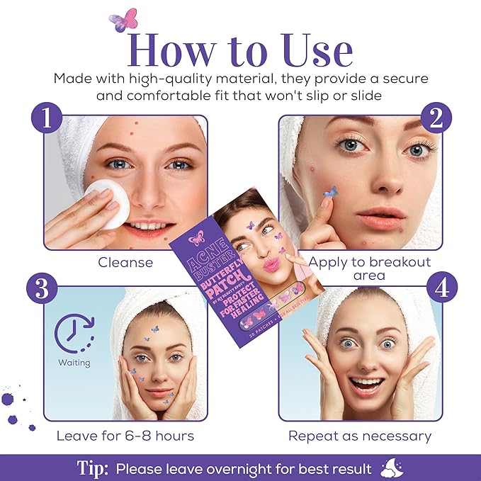 - PROTECT AND HEAL: These acne patches are designed to be a protective covering while treating blemishes, preventing further irritation, and promoting faster healing. Say goodbye to unsightly acne, simply apply to the affected area and watch as they work their magic, clearing up blemishes and leaving your skin looking clear and radiant.
