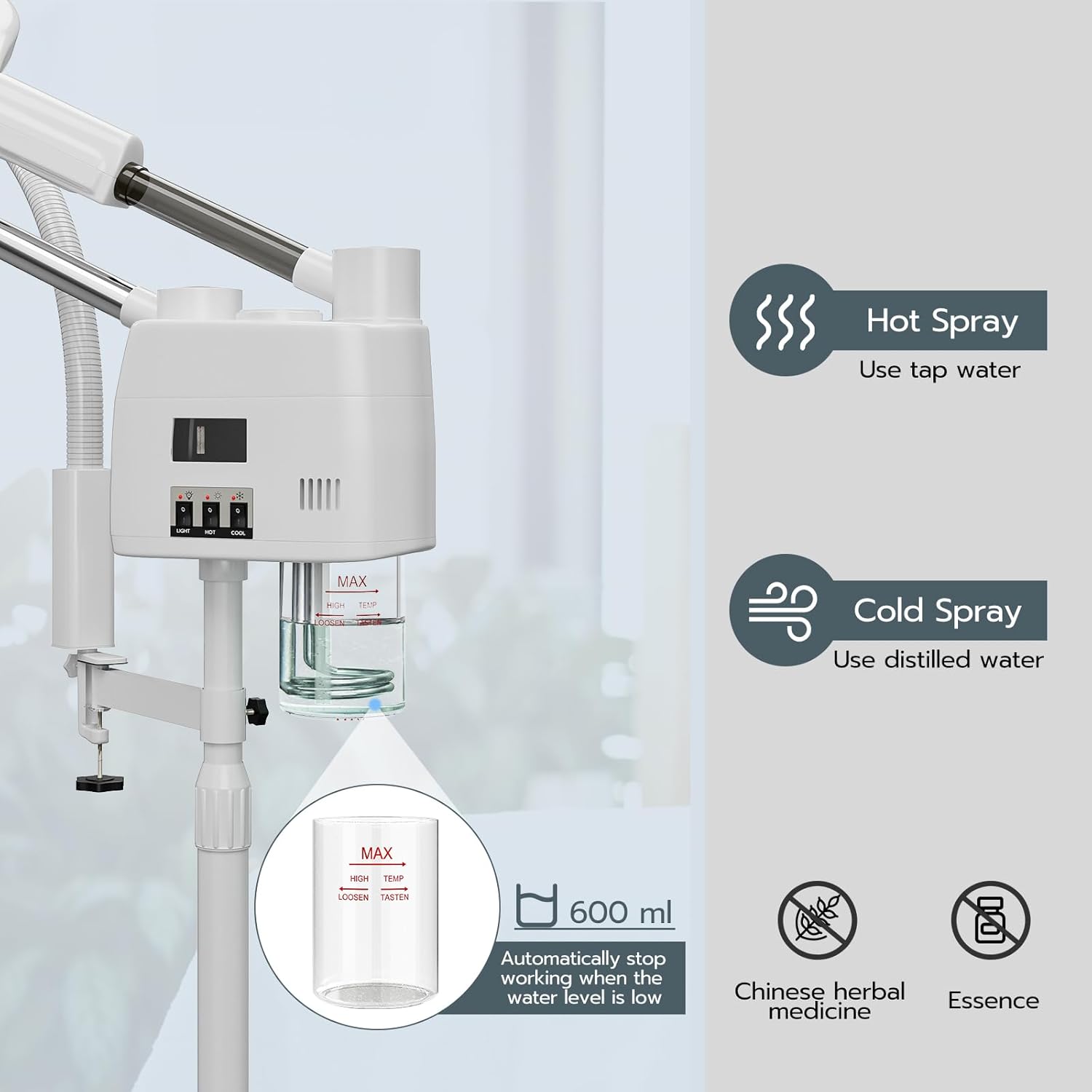 - [Safe & Durable] The water cup is made of ABS plastic and not be easily broken compared to glass, will automatically stop working when there is water shortage to prevent damage to the machine due to overheating. Note that Hot Spray use tap water, Cold Spray use distilled water.