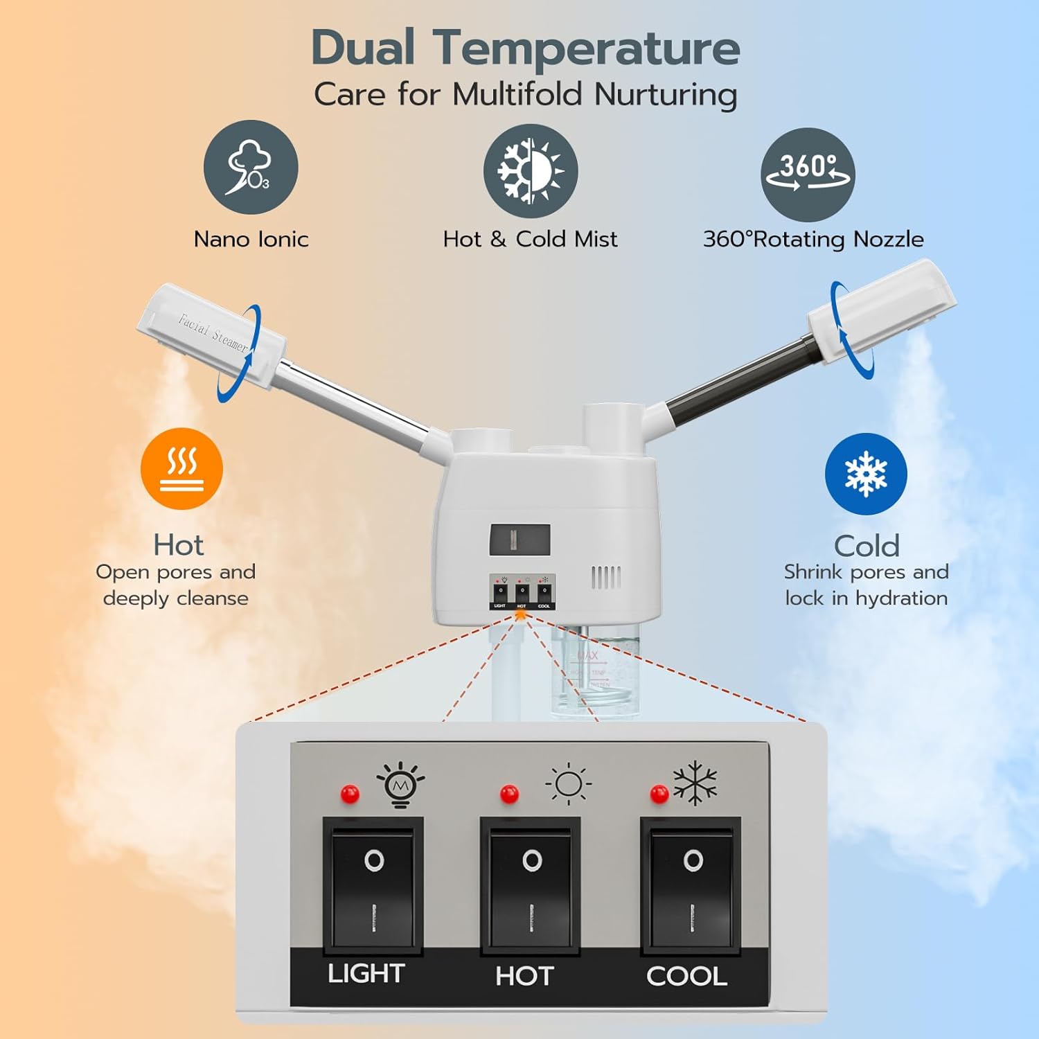 - [Keep Your Skin Healthy & Radiant] Equipped with hot and cold nozzles, Paddie 3 in 1 facial steamer offer gentle steam spray that can open up, unclog, shrink your pores and lock in hydration, use before skin care routine which help your skin absorb serum or essential oil easier.
