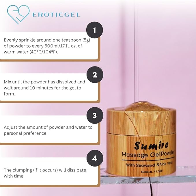 - Our Massage Gel Powder is made with natural ingredients like seaweed and aloe vera, offering a safe and nourishing massage experience. It’s free from parabens and glycerine for peace of mind.