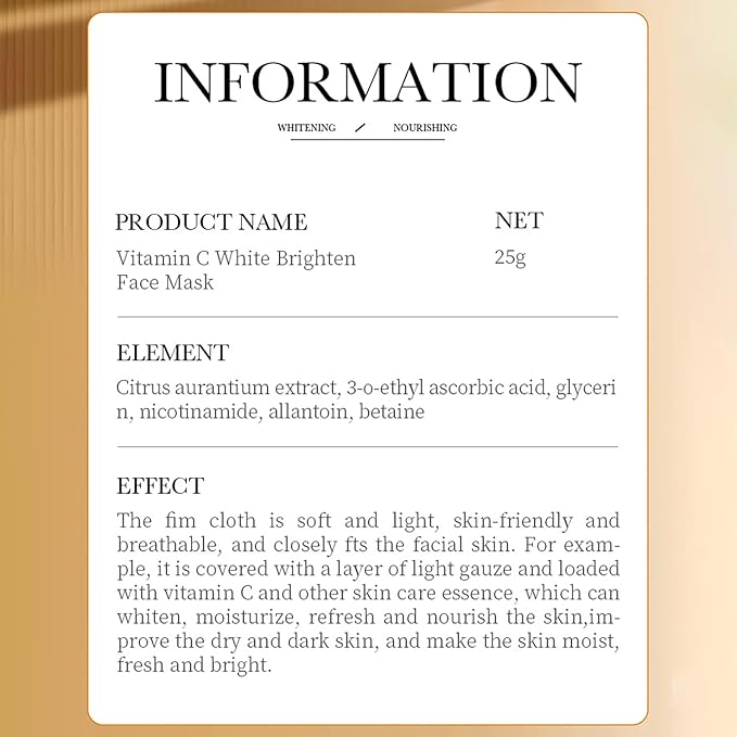 BIOAQUA Vitamin C Facial White Face Mask Orange Extract Moisturizing Hydrating 10x Antioxidant 5x25g/0.88fl.oz