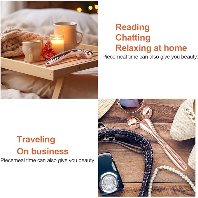 - [Versatile Application] Our massager tool kit comes with a rose gold 3D roller and an ice globe, which is not limited to facial use; it can also be applied to other body areas such as the eye, neck, arms, leg, etc,. Continuous massage helps improve facial skin firmness, promotes the absorption of skincare products, reduces the formation of wrinkles, and smooths fine lines, presenting us with a more youthful and toned complexion