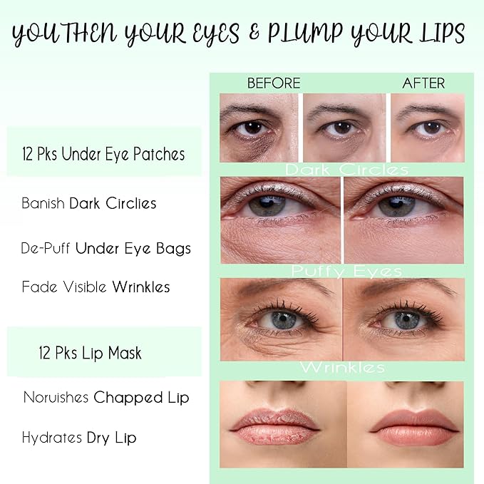 CCbeauty 24 Packs Lip Masks & Eye Mask Bulk,24K Gold Under Eye Patches for Puffy Eyes,Dark Circles,Collagen Eye gel Pads for Eye Bags,Wrinkles | Nourish & Hydrate Dry Chapped Lips Skincare,Golden