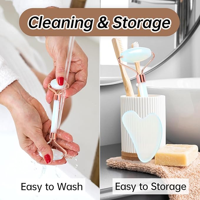 Opal Gua Sha and Face Roller, Real Jade Gua-Sha Stone Facial Tools Set for Reduce Puffiness, Body Guasha Tool for Relieve Neck Tension, SinkCare Beauty Massager as Present for Women,Opal