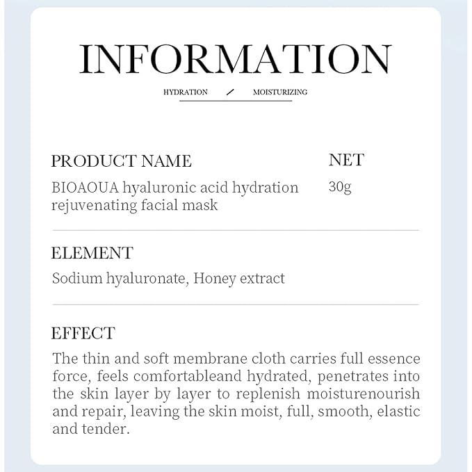 - 4. BIOAOUA moisturizing anti-aging face mask with hyaluronic acid. The thin and soft membrane fabric carries all the power of the essence, feels comfortable and moisturized, penetrates the skin layer by layer, replenishing moisture, nourishing and restoring, leaving the skin moist, full, smooth, elastic and tender.