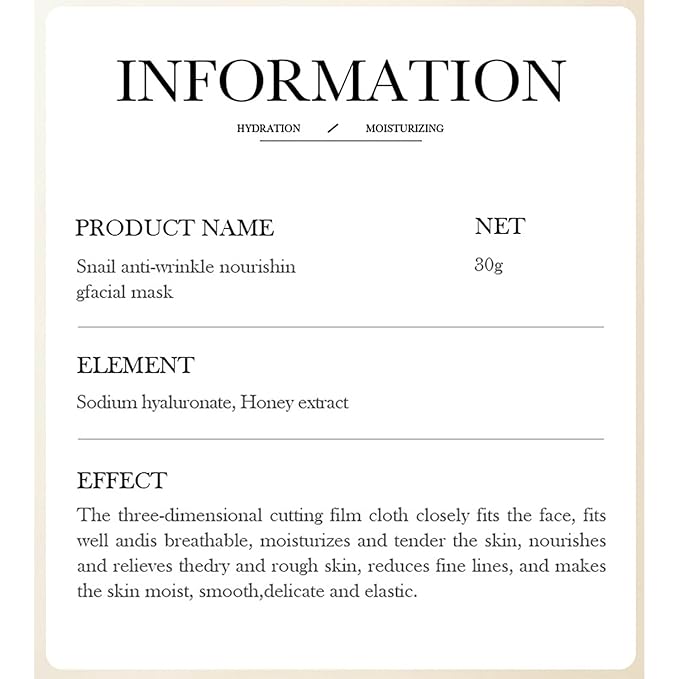 - 1. Nourishing anti-wrinkle face mask with snail. The three-dimensional film cutting fabric fits snugly to the face, fits well and lets in air, moisturizes and softens the skin, nourishes and relieves dry and rough skin, reduces wrinkles and makes the skin moist, smooth, tender and elastic.