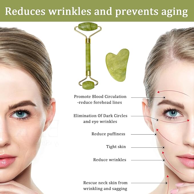 - 【Product Care】: Please wash the Jade Roller and Gua Sha Stone before and after use. Although it's not required, you can keep the Jade Roller in the refrigerator to reduce facial redness, swelling, or discomfort following invasive procedures like micro needling or peels.