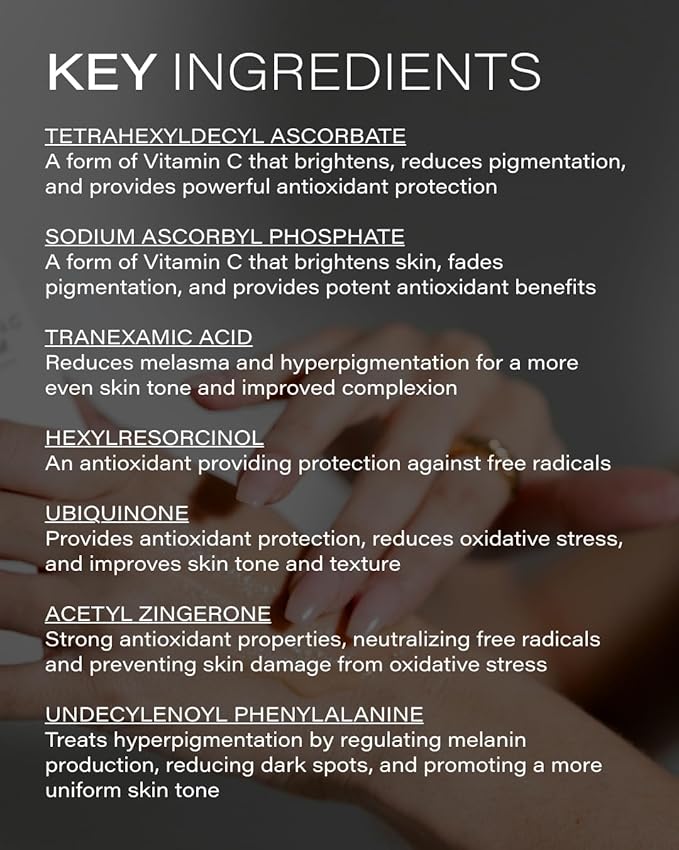 - Special Ingredients : 5% Tetrahexyldecyl Ascorbate: A stable and oil-soluble form of Vitamin C 2% Sodium Ascorbyl Phosphate: A stable form of Vitamin C 2% Tranexamic Acid 2% Hexylresorcinol Ubiquinone: Also known as Coenzyme Q10 Acetyl Zingerone Undecylenoyl Phenylalanine Tocopherol: Known as Vitamin E Acetyl Hexapeptide-8: lovingly known as “Botox in a Jar” 4% Niacinamide, TXA, Turmeric, 5% Tetrahexyldecyl Ascorbate, 2% Sodium Ascorbyl Phosphate, Vitamin C 5% Tetrahexyldecyl Ascorbate: A stable and oil-soluble form of Vitamin C 2% Sodium Ascorbyl Phosphate: A stable form of Vitamin C 2% Tranexamic Acid 2% Hexylresorcinol Ubiquinone: Also known as Coenzyme Q10 Acetyl… See more