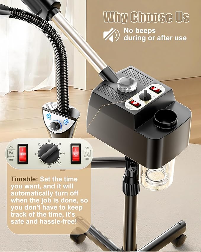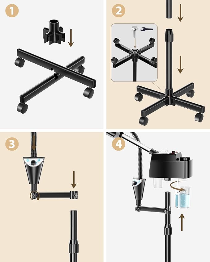 - Easy to assemble: The steamer esthetician adopts humanized design, you receive the goods with the wheels already installed. We will give all the steamer face a function test before shipment to ensure that all received esthetician steamer can be used normally, if there is residual water stains in the water cup is normal.