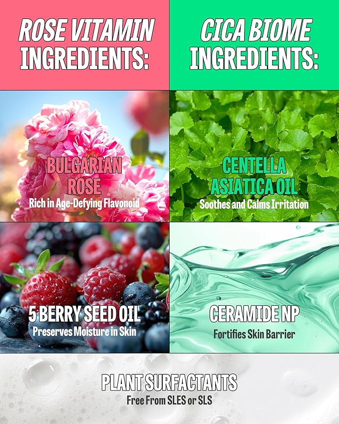 K-Beauty Rose Vitamin + Cica Biome Foam Gift Set | Daily Face Wash - Oil Based Cleanser to Foam | Korean Skin Care for Dry Sensitive Skin | Face Cleanser Bundle