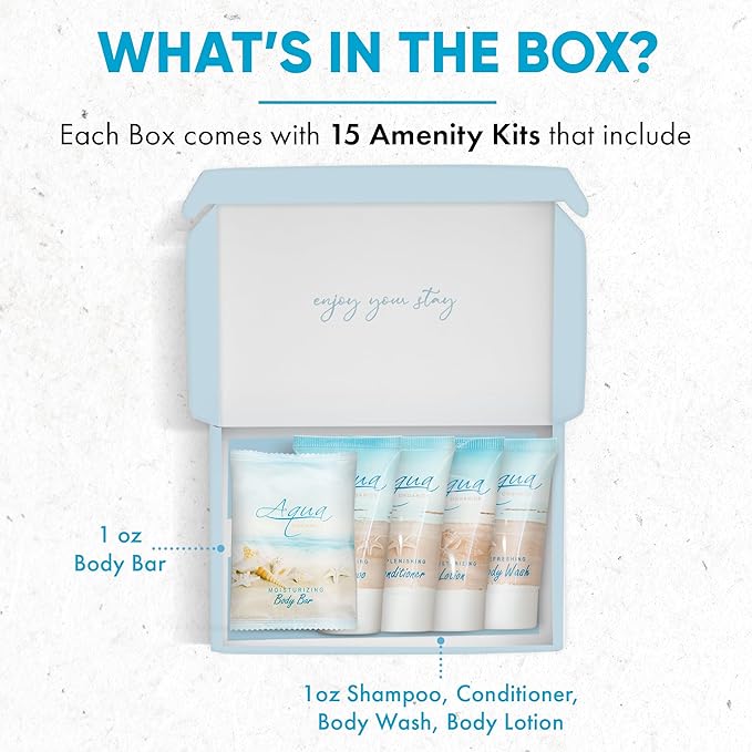 - COMPREHENSIVE 15-BOX CASE: Elevate your guest experience with our Guest Boxes that include 1 of each of the following: shampoo, conditioner, body lotion, body wash, and body bar.