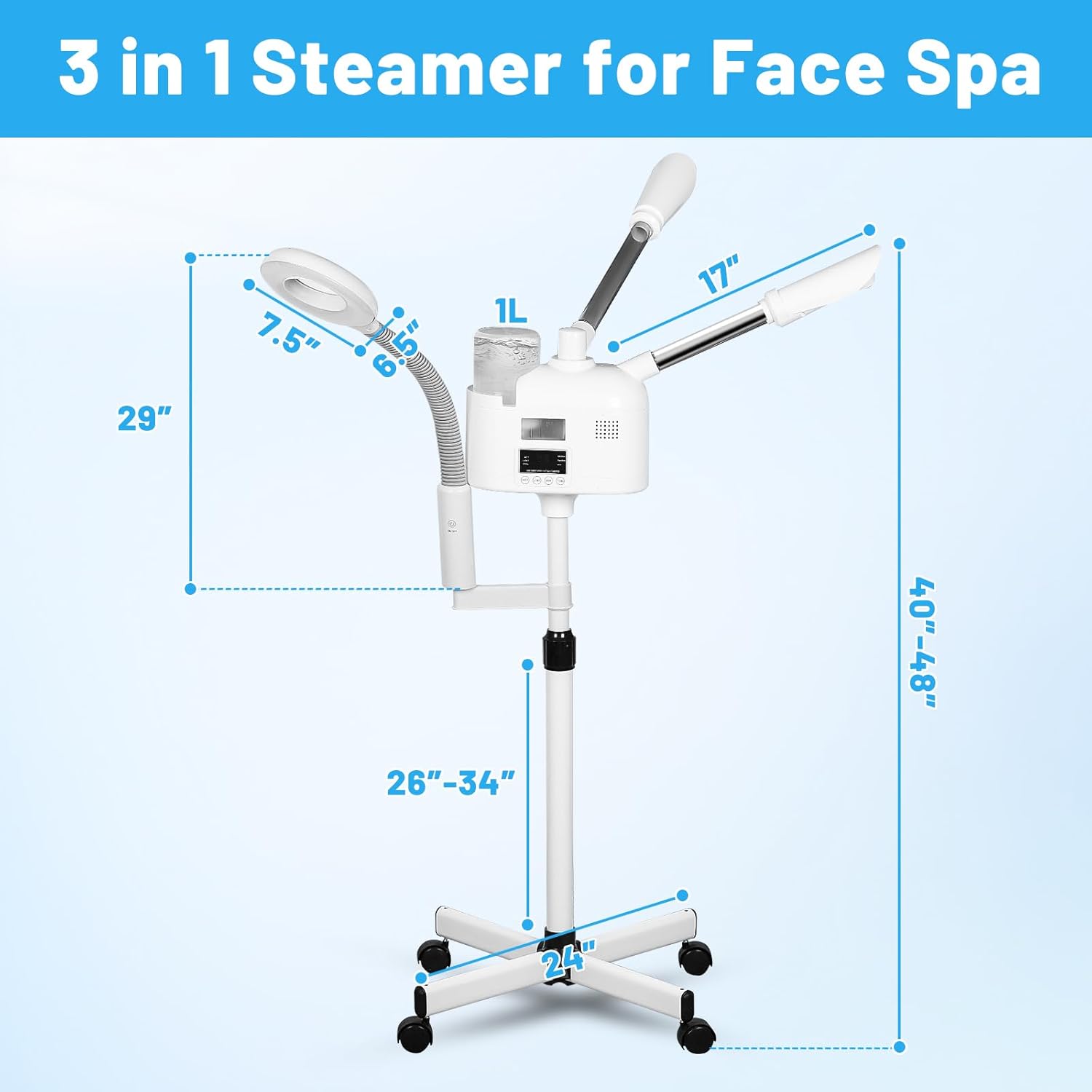 - GREAT QUALITY - Steamer for face spa on wheels,high quality warm stainless steel pipe, sturdy and durable, high capacity water cup, can store 1000ml water, the steamer generates the mist quickly with 1-3mins,the head of the machine is free to rotate 360°. Adjustable height from 38.1" - 48"