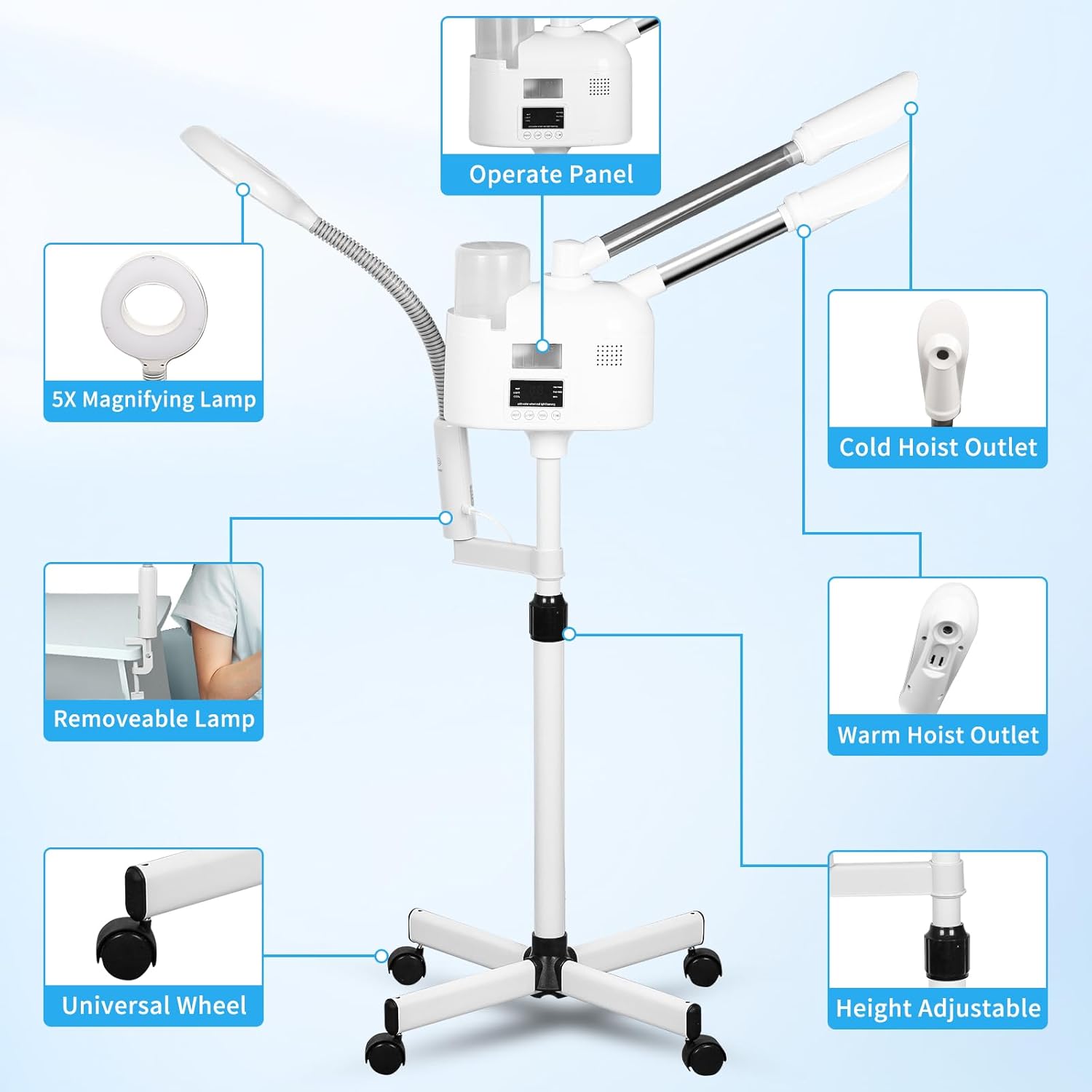 - 5X MAGNIFYING LAMP - Super clear magnifier LED light,can be used alone or fixed in facial steamer stand,the 3 adjustable lighting accurately complements the shadow,can help better clean the pores or the do the beauty project