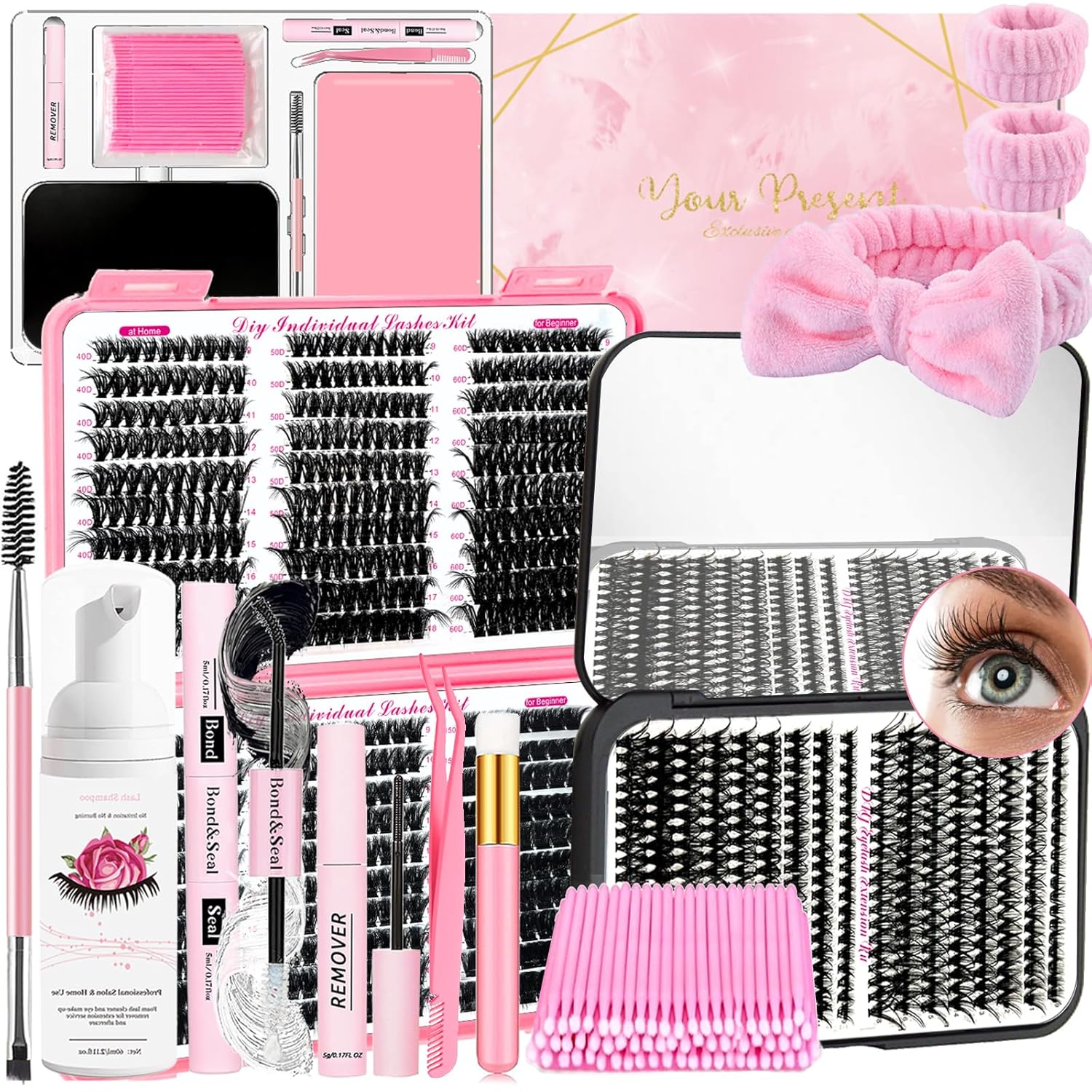 - What will you get: Our cluster eyelash extension kit contains the accessories needed for eyelash extension, 560 clusters eyelashes,340 clusters of individual eyelashes, 1*lash bond and seal strong hold, 1*lash glue remover, 1*2.11 fl.oz (60ml) eyelash shampoo, 1*lash shampoo brush, 1*shower headbands, 2*matching wristbands, 1*double headed eyelash brushes, 1*dual use curved tweezers, 100*mini applicator. Provide everything you need for DIY eyelash extensions at home!