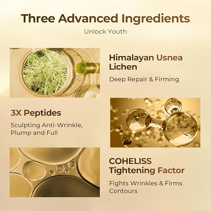 - Three Cutting-Edge Ingredients for Restoring Youthful Skin: A powerful blend of three advanced anti-aging ingredients. Himalayan Usnea Lichen deeply repairs and firms the skin. 3X Peptides help sculpt facial contours, smooth wrinkles, and enhance plumpness. COHELISS tightening agent targets deep lines, boosting skin elasticity and defining facial contours for a more youthful appearance.