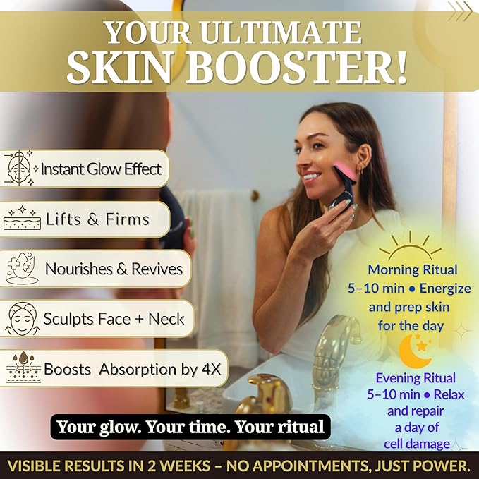 - 3-in-1 Glow Technology Our triple-action device uses light, vibration, and heat to support a more sculpted, lifted look—especially along the jawline, cheeks, and neck. Great for enhancing your skin’s natural contour.