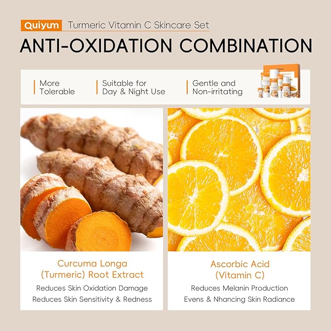 - 【Natural Skincare】QUIYUM Turmeric Vitamin C Skin Care Set includes cleanser, toner, essence, eye cream and face cream. can deeply cleanse the skin while also reducing sebaceous gland oil secretion; Furthermore, they are effective in the reduce of acne, the balance of skin discoloration, and the smoothing of the skin