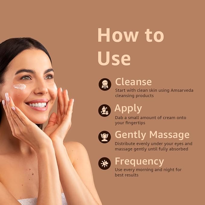 - Recommended Uses For Product : Cleanse: Start with clean skin using Amsarveda cleansing products. Apply: Dab a small amount of our eye cream onto your fingertips. Gently Massage: Distribute evenly under your eyes and massage gently until fully absorbed. Frequency: Use every morning and night for best results Cleanse: Start with clean skin using Amsarveda cleansing products. Apply: Dab a small amount of our eye cream onto your fingertips. Gently Massage: Distribute evenly under your eyes and massage gently until fully absorbed.… See more