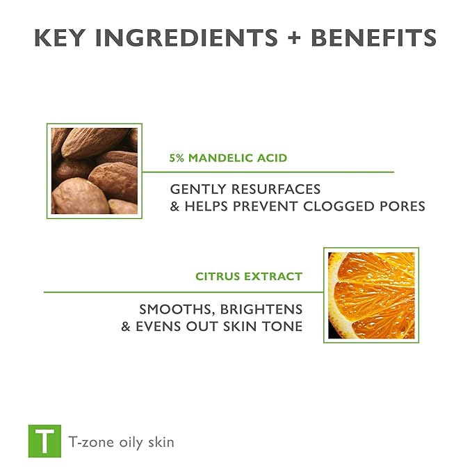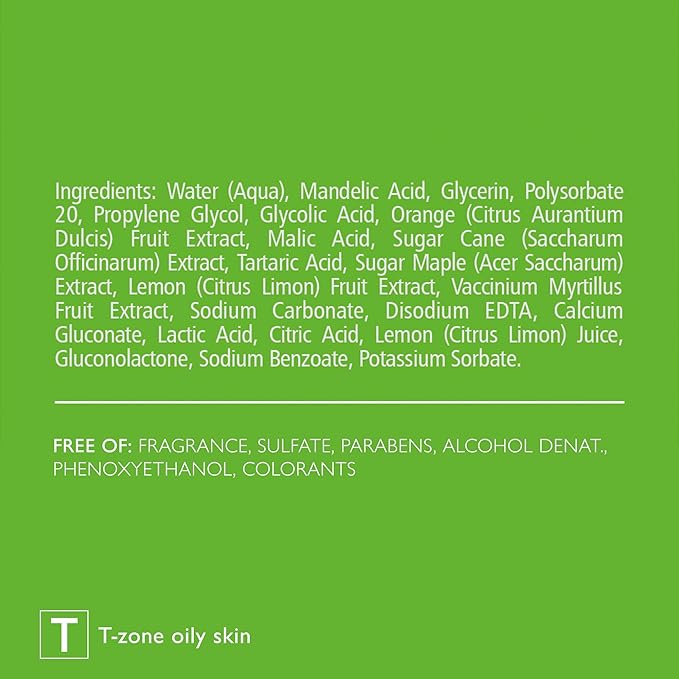 - 5% Mandelic Acid: Exfoliates, regenerates, and regulates comedone formation to minimize eruptions and visibly reduce blemishes.