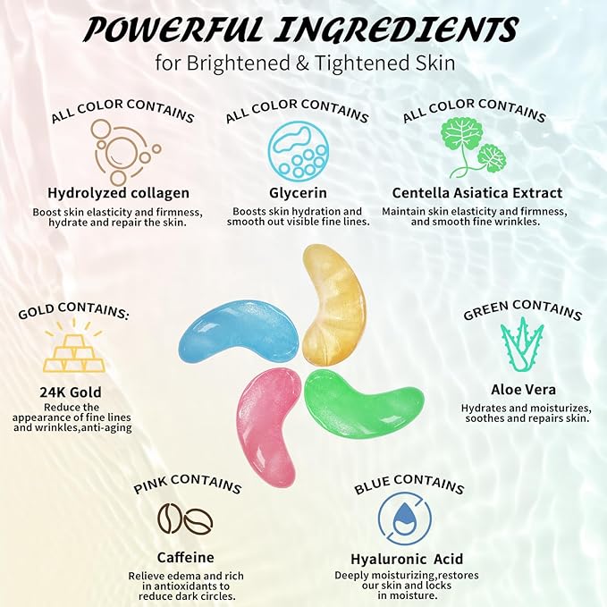 - Comprehensive Eye Care Gift Set: This gift set includes 28 pairs of under-eye patches, 7 pairs of each color. 24k Gold eye mask helps to smooth the skin, reduce fine lines and wrinkles. Caffeine eye patches help promotes eye metabolism and circulation, and reduces eye bags and puffy eyes. Hyaluronic acid eye masks help to fade dry lines and wrinkles, and locks in moisture and nutrition. Aloe vera eye patch helps to reduce pigmentation, repair the healing barrier, and gently moisturize the skin. It’s a complete eye-care solution for anyone looking to add luxury to their self-care routine.